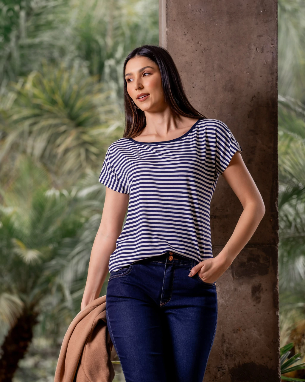 Descubra a Blusa Listrada com manga morcego, uma verdadeira peça chave para o seu guarda-roupa. Com um ótimo caimento e um elegante decote canoa, esta blusa é perfeita para compor looks que vão do casual ao sofisticado.
